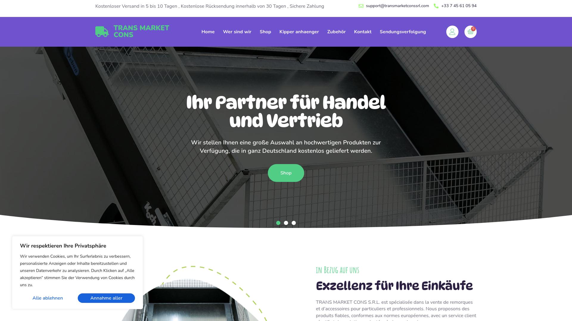Die Webseite „Trans Market Cons“ präsentiert sich als Anbieter von Produkten, die hauptsächlich im Bereich Handel und Vertrieb angesiedelt sind. Im Vordergrund stehen eine Vielzahl von hochwertigen Produkten, die für Kunden in Deutschland verfügbar sind. Die Seite betont, dass sie kostenlosen Versand innerhalb Deutschlands anbietet, sowie die Möglichkeit der Rücksendung innerhalb eines Zeitrahmens von 30 Tagen. Die Zahlungsmethoden werden als sicher dargestellt. Das Hauptaugenmerk der Webseite liegt offenbar auf Anhängern, die offenbar für verschiedene Zwecke eingesetzt werden können. Dabei könnte es sich um Kipperanhänger handeln, die für den Transport von Waren, Materialien oder anderen Gegenständen geeignet sind. Die Webseite sieht eine benutzerfreundliche Navigationsstruktur vor, die es den Besuchern erleichtert, die Produktkategorien zu durchsuchen und die verfügbaren Artikel zu finden. Zusätzlich wird auf der Seite darauf hingewiesen, dass der Anbieter eine große Auswahl an Zubehör bietet, möglicherweise um die Nutzer bei der Ausrüstung ihrer Anhänger oder beim Kauf von ergänzenden Produkten zu unterstützen. Es wird ein Kontaktbereich ausgewiesen, über den Besucher Fragen an den Anbieter richten können, sowie eine Funktion zur Sendungsverfolgung, um den Status der Bestellungen nachzuvollziehen. Die Informationen auf der Webseite sind sowohl in deutscher als auch in französischer Sprache verfasst, was darauf hindeutet, dass das Unternehmen möglicherweise eine breitere Zielgruppe ansprechen möchte, die sowohl Deutsch- als auch Französischsprechendes umfasst. Die Präsentation der Webseite beinhaltet des Weiteren ein modernes Design und eine klare Struktur, die darauf abzielt, eine positive Benutzererfahrung zu ermöglichen. Die Datenschutzerklärung, die auf die Verwendung von Cookies hinweist, zeigt, dass der Anbieter die Einhaltung vertraulicher Informationen und eine bessere Anpassung des Online-Angebotes an die Bedürfnisse der Nutzer anstrebt. Dies wird durch den Hinweis auf die Möglichkeit der Ablehnung oder Zustimmung zur Verwendung von Cookies verdeutlicht. Die Webseite bietet somit eine umfassende Plattform für potenzielle Kunden, die an Anhängern und Zubehör interessiert sind, und stellt grundlegende Informationen über das Produktangebot sowie die Verkaufs- und Versandbedingungen bereit.
