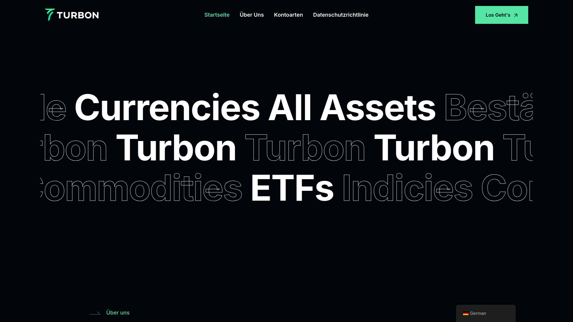 Die Webseite „TURBON“ scheint sich auf Finanzdienstleistungen zu konzentrieren und bietet eine Vielzahl von Informationen zu verschiedenen Anlageklassen an. Die Hauptkategorien, die auf der Seite hervorgehoben werden, umfassen Währungen, Rohstoffe, ETFs (Exchange Traded Funds) und Indizes. Die Startseite enthält prägnante und auffällige Texte, die auf eine breite Palette von Assets hinweisen, die Nutzer möglicherweise in Betracht ziehen könnten. Es werden Begriffe wie „Währungen“, „Rohstoffe“ und „ETFs“ verwendet, um die unterschiedlichen Anlagen zu kennzeichnen, die potenziell behandelt oder angeboten werden. Diese Begriffe deuten darauf hin, dass die Webseite Informationen zu den jeweiligen Märkten, Produkten und deren Handelsmöglichkeiten bereitstellen könnte. In der Menüleiste findet sich ein Abschnitt „Über uns“, der Informationen über die Betreiber der Webseite enthalten könnte. Dies könnte potenziellen Nutzern Einblicke in die Unternehmensphilosophie, die rechtlichen Rahmenbedingungen oder die angebotenen Dienstleistungen geben. Ein weiterer Abschnitt bezieht sich auf „Kontoarten“, was darauf hindeutet, dass Nutzer möglicherweise unterschiedliche Arten von Konten wählen können, je nach ihren individuellen Bedürfnissen oder Handelsstrategien. Zusätzlich gibt es einen Link zur „Datenschutzrichtlinie“, was auf die Einhaltung von Datenschutzbestimmungen hindeutet. Diese Informationen könnten für Nutzer von Bedeutung sein, die sich über den Umgang mit ihren persönlichen Daten und den Schutz ihrer Informationen informieren möchten. Die Darstellung auf der Webseite ist visuell ansprechend, mit einer dunklen Hintergrundgestaltung und großen, auffälligen Schriftzügen, die die wiederkehrenden Begriffe hervorheben. Dies könnte darauf abzielen, die Aufmerksamkeit der Besucher zu fangen und sie zu den wichtigsten Themen zu leiten. Insgesamt legt die Webseite den Schwerpunkt auf finanzielle Angebote und verschiedene Anlageklassen. Die genaue Funktionsweise, die angebotenen Dienstleistungen und die Zielgruppe könnten jedoch durch weitere Informationen ergänzt werden, die möglicherweise nicht direkt auf der Startseite sichtbar sind.
