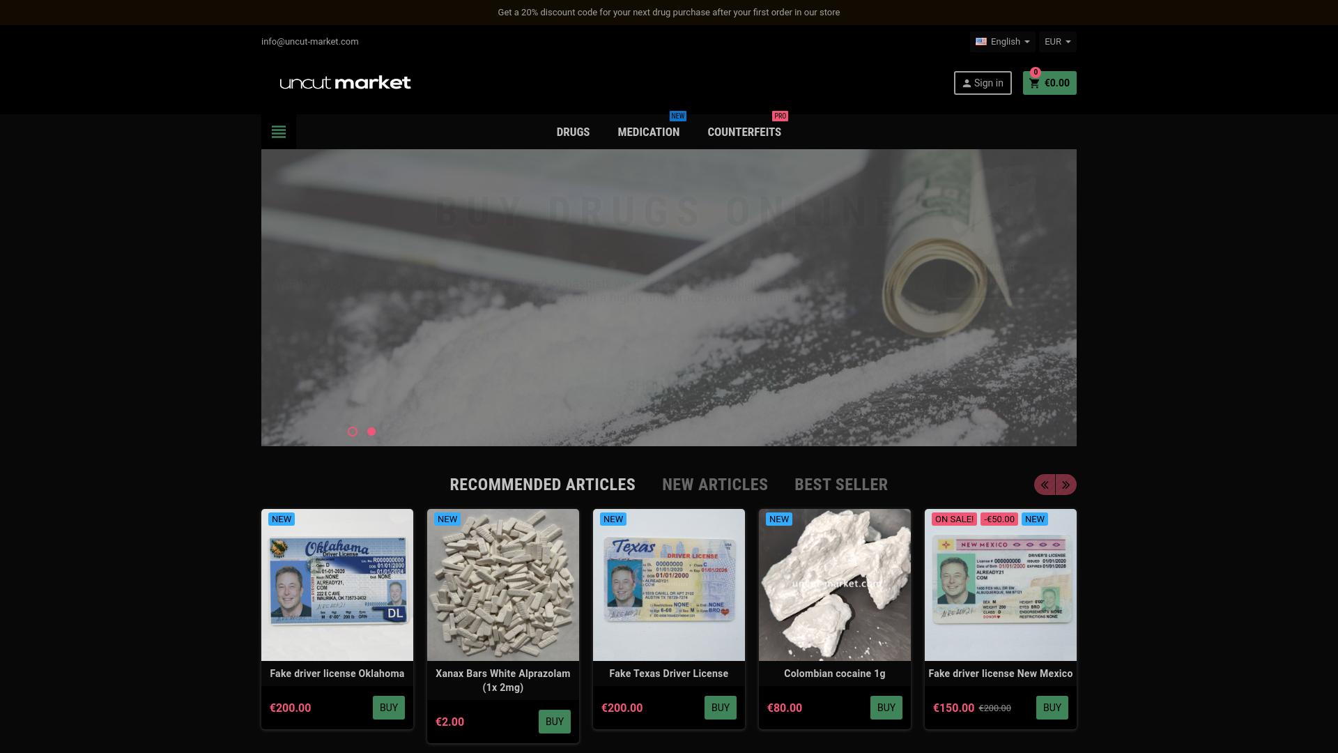 Die Webseite uncut.market bietet eine Auswahl an Produkten, die in verschiedene Kategorien unterteilt sind, darunter Medikamente, Drogen und gefälschte Dokumente. In der Sektion „Drogens“ werden Produkte aufgelistet, die als Betäubungsmittel beschrieben werden, wie zum Beispiel verschiedene Arten von Xanax. Die Preise für diese Artikel variieren und sind direkt auf der Seite angegeben. Ein Produkt, das aufgeführt ist, sind „Xanax Bars White Alprazolam“ zum Preis von 2 Euro für eine Einheit. Ein weiterer Bereich der Seite ist der Verkauf von gefälschten Führerscheinen aus verschiedenen Bundesstaaten der USA. Diese gefälschten Dokumente sind mit Preisen versehen, beispielsweise kostet ein gefälschter Führerschein aus Oklahoma 200 Euro. Zudem sind Führerscheine aus Texas und New Mexico aufgelistet, jeweils ebenfalls zu einem Preis von 200 Euro und 150 Euro, wobei letzterer derzeit einen reduzierten Preis von 100 Euro aufweist. Zusätzlich gibt es eine Kategorie für „Best Seller“, in der Produkte hervorgehoben werden, die häufiger verkauft werden. In dieser Kategorie ist beispielsweise „Colombian cocaine 1g“ zu einem Preis von 80 Euro aufgeführt. Die Webseite verwendet eine dunkle Farbpalette und bietet eine einfache Navigation mit Menüpunkten, die den Zugriff auf die verschiedenen Produktkategorien erleichtern. Am oberen Rand der Seite sind auch Anmelde- und Sprachoptionen zu finden, die den Nutzern eine Anpassung der Nutzererfahrung ermöglichen. Insgesamt konzentriert sich uncut.market auf den Verkauf von potenziell illegalen Substanzen und gefälschten Dokumenten, wobei sowohl neue als auch empfohlene Artikel gesondert hervorgehoben werden.
