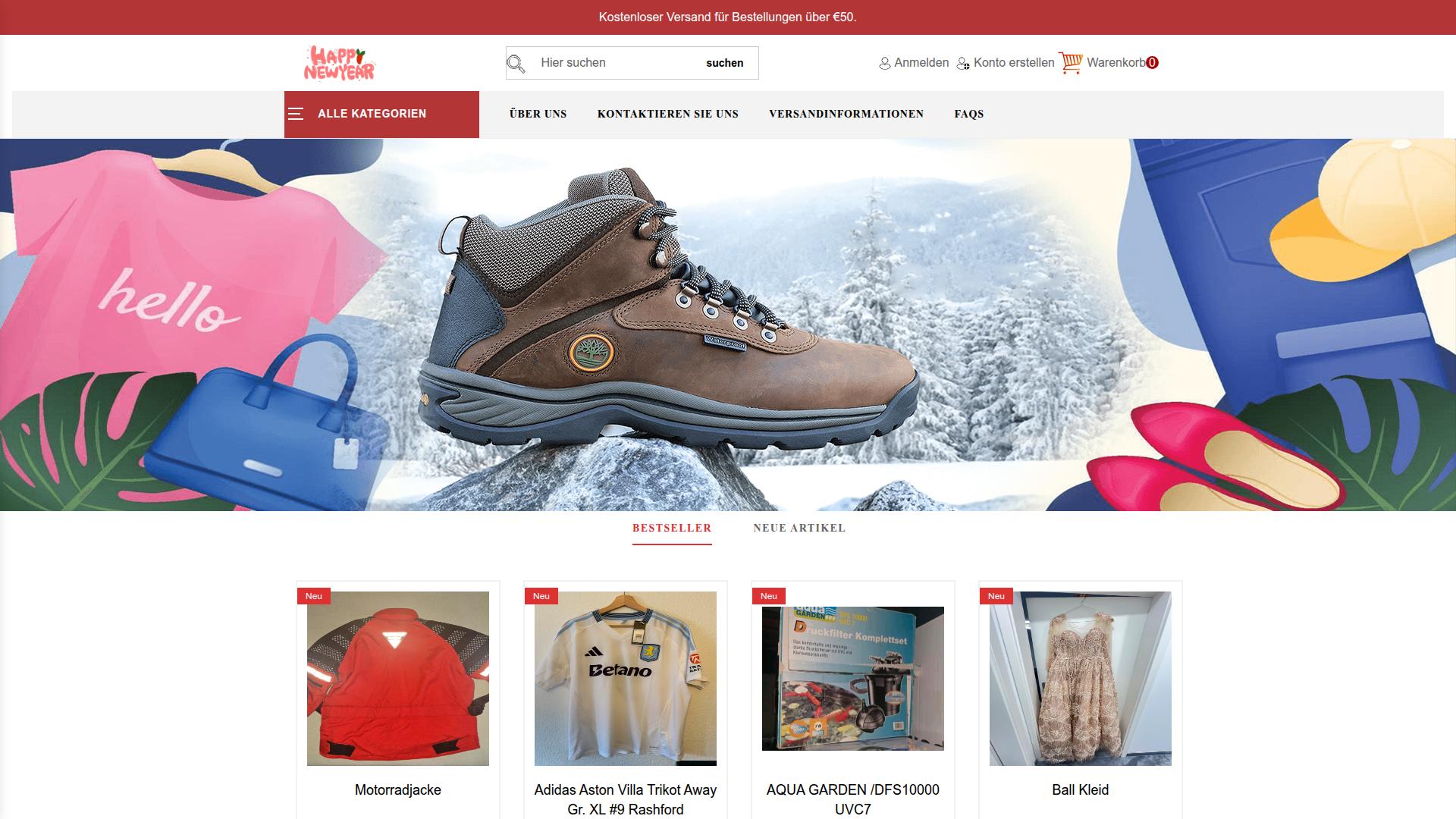 Die Webseite bietet eine Vielzahl von Produkten aus unterschiedlichen Kategorien an, darunter Kleidung, Schuhe und Haushaltsartikel. Im oberen Bereich der Seite befindet sich eine auffällige Grafik mit dem Text „Happy New Year“, die in einem festlichen Kontext gestaltet ist. Zu den angebotenen Artikeln zählen eine Motorradjacke, ein Adidas-Trikot mit der Aufschrift „Betano“ und der Spielernummer 9, sowie ein Produkt mit der Bezeichnung „Aqua Garden / DFS10000 UVC7“, das wahrscheinlich im Bereich der Haushaltsgeräte oder Bewässerungssysteme angesiedelt ist. Des Weiteren wird ein Ballschloss, das als Ballkleid bezeichnet wird, angeboten. Diese Artikel sind in einem Bereich für „Neu“ markiert, was darauf hinweist, dass sie kürzlich zum Sortiment hinzugefügt wurden. Auf der Startseite gibt es zusätzlich eine Sektion für „Bestseller“, die wahrscheinlich populäre oder häufig gekaufte Produkte zeigt, allerdings sind diese im vorliegenden Screenshot nicht detailliert aufgeführt. Im oberen Teil der Webseite findet sich ein Menü, das zur Navigation zu verschiedenen Kategorien und Informationen wie „Über uns“, „Kontaktieren Sie uns“, „Versandinformationen“ und „FAQs“ einlädt. Es wird auch ein kostenloser Versand für Bestellungen über 50 Euro beworben. Die Suchfunktion ermöglicht es Nutzern, gezielt nach bestimmten Produkten zu suchen. Die Webseite verwendet eine moderne оформления mit einem klaren Layout, das es Nutzern erleichtert, durch die verschiedenen Angebote zu navigieren. Grafische Elemente und Bilder der Produkte sind farbenfroh und ansprechend gestaltet, um die Aufmerksamkeit der Besucher zu gewinnen. Die Beschreibung der Webseite legt den Fokus auf die angezeigten Produkte und deren Präsentation ohne eine Bewertung der Qualität oder Vertrauenswürdigkeit der Website vorzunehmen. Die angebotenen Artikel sind vielseitig und richten sich an eine breite Zielgruppe, die an Bekleidung sowie Haushaltswaren interessiert ist.