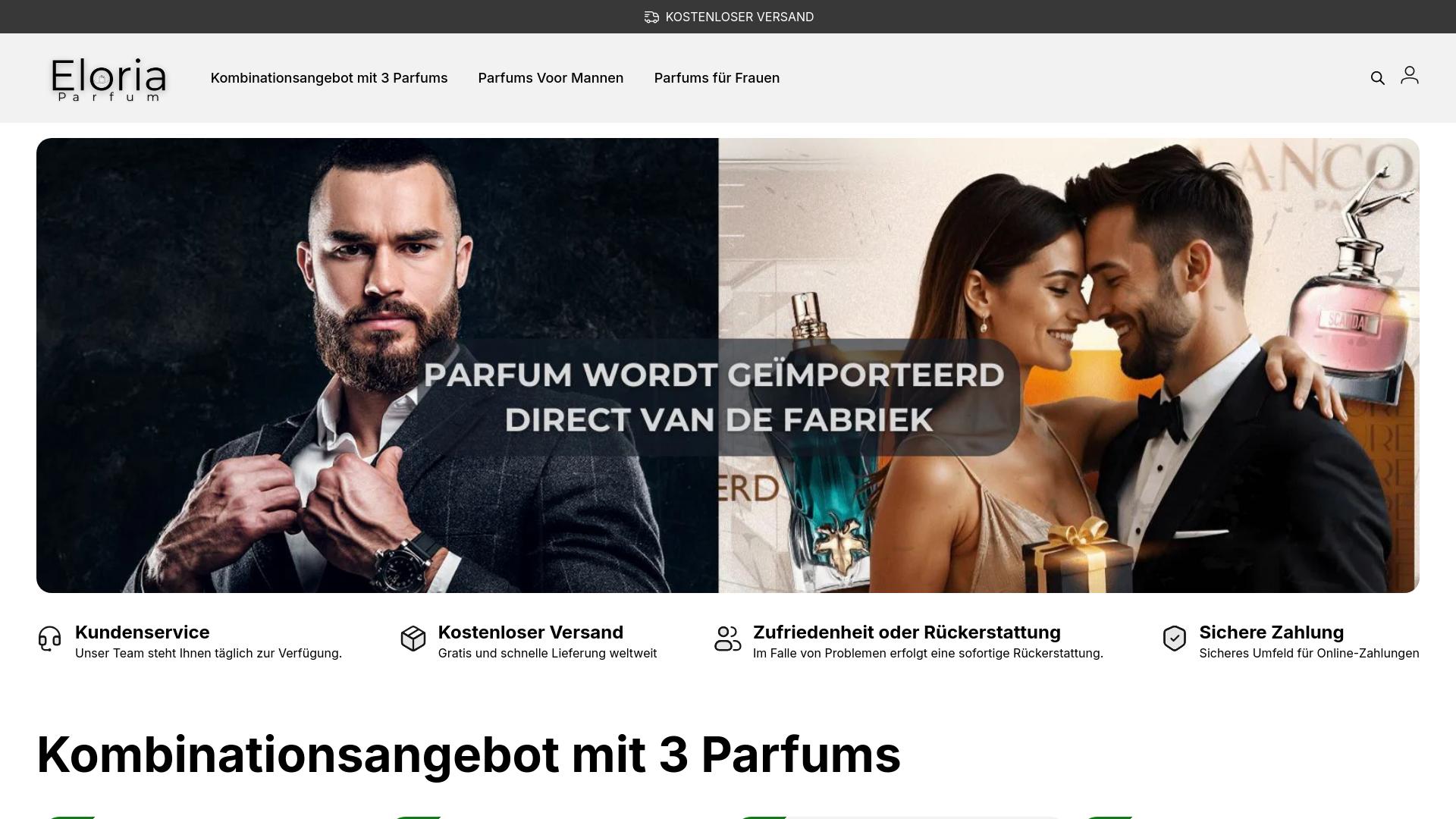 Die Webseite Eloria Parfum bietet eine Auswahl an Parfums für Männer und Frauen an. Auf der Startseite wird ein Kombinationangebot hervorgehoben, bei dem Nutzer drei verschiedene Parfums erwerben können. Die Produkte scheinen direkt von der Fabrik importiert zu werden, was auf einen möglicherweise direkten Vertriebsweg hinweisen könnte. Die Seite enthält unterschiedliche Sektionen, die Informationen zu den angebotenen Parfums bereitstellen. Zudem wird ein Kundenservice angeboten, der Nutzern die Möglichkeit gibt, bei Fragen oder Problemen Kontakt aufzunehmen. Auf der Seite wird auch kostenloser Versand beworben, was eine Versandoption ohne zusätzliche Gebühren signalisiert. Darüber hinaus wird eine Rückerstattungsgarantie erwähnt, die Kunden im Falle von Unzufriedenheit oder weiteren Problemen eine Erstattung verspricht. Das Unternehmen scheint ebenfalls Wert auf die Sicherheit von Online-Zahlungen zu legen, da es ein sicheres Umfeld für diese Anmerkungen auf der Webseite gibt. Visuell präsentiert sich die Seite mit ansprechenden Bildern, die sowohl männliche als auch weibliche Modelle zeigen, die in Verbindung mit den angebotenen Parfums stehen. Dies könnte darauf abzielen, die Zielgruppe für die jeweiligen Produkte visuell anzusprechen. Die Darstellung der Parfums wird durch thematische Illustrationen ergänzt, die ebenfalls den Lifestyle und die Nutzung der Produkte suggerieren. Insgesamt bietet die Webseite Eloria Parfum eine Plattform, auf der verschiedene Parfums in Kombinationen verkauft werden, kombiniert mit Dienstleistungen wie Kundenservice, Rückerstattungsoptionen und sicherem Zahlungsverkehr.