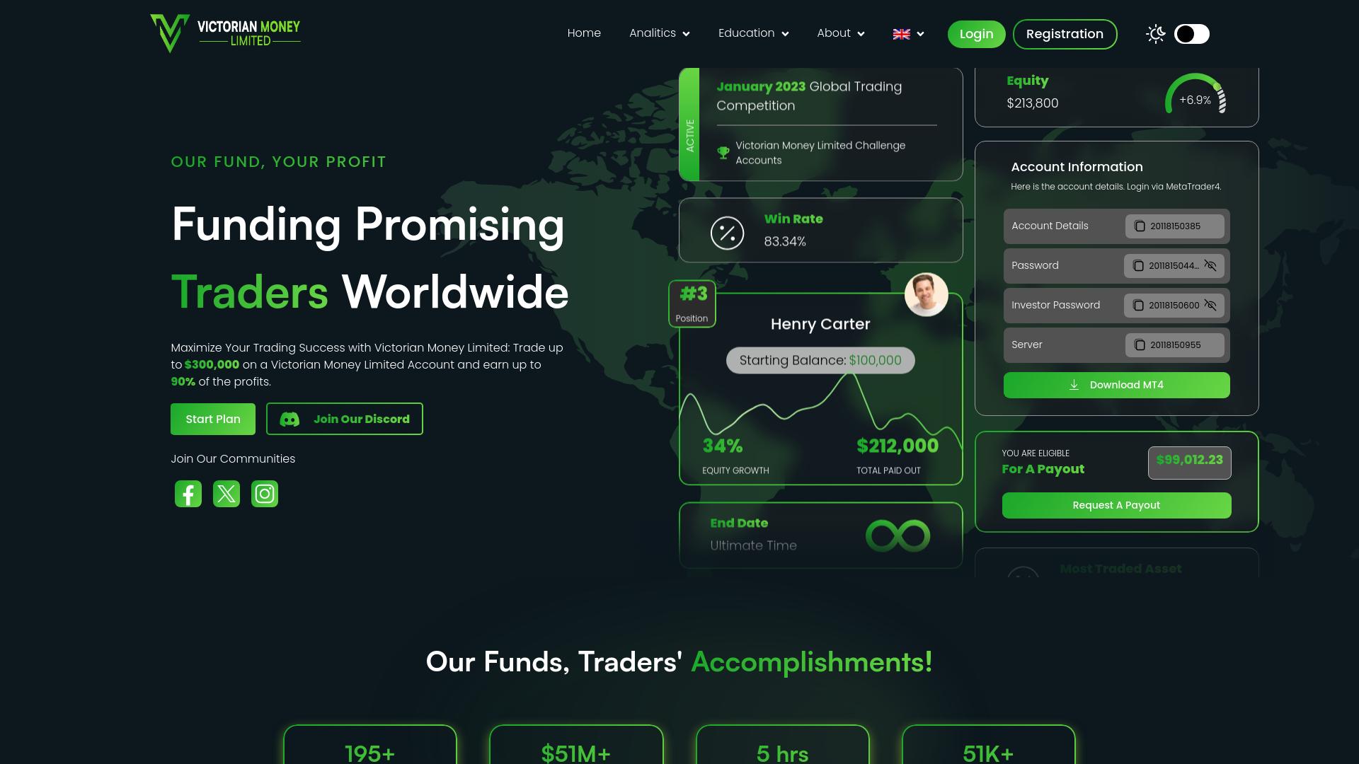 Die Webseite Victorian Money Limited präsentiert sich als Plattform, die darauf abzielt, vielversprechende Trader weltweit zu finanzieren. Auf der Startseite wird hervorgehoben, dass Nutzer die Möglichkeit haben, auf einem speziellen Konto bis zu 300.000 US-Dollar zu handeln und bis zu 90% der erzielten Gewinne zu behalten. Ein zentraler Bereich der Webseite ist die Darstellung der Leistungsdaten verschiedener Trader. Beispielsweise wird ein Trader namens Henry Carter erwähnt, dessen Ausgangsbetrag 100.000 US-Dollar betrug und der eine Eigenkapitalrendite von 34% erzielt hat, was zu einer Gesamtauszahlung von 212.000 US-Dollar führt. Diese Informationen sind Teil einer Wettbewerbsübersicht, die anzeigt, dass Henry Carter Platz 3 in einer globalen Handelsaktion innehat, bei der eine Gewinnrate von 83,34% angegeben wird. Eine solche Aufstellung soll die Erfolge der Trader und die Performance des Fonds hervorheben. Die Webseite bietet auch Links zu verschiedenen sozialen Medien und einer Discord-Community an, was darauf hindeutet, dass Nutzer möglicherweise die Möglichkeit haben, sich mit anderen Tradern auszutauschen und Gemeinschaftsressourcen zu nutzen. Es wird eine Schaltfläche angeboten, um einen Handelsplan zu starten oder die Software MetaTrader 4 herunterzuladen, die für den Handel verwendet werden kann. Zusätzlich werden einige statistische Daten zur allgemeinen Performance des Fonds präsentiert, einschließlich einer Gesamtsumme von mehr als 51 Millionen US-Dollar, die den Tradern ausgezahlt wurden, und einer Gesamtzahl von über 195 aktiven Tradern, die an der Plattform teilnehmen. Die Webseite erscheint funktional und verfügt über eine klare Struktur, mit verschiedenen Menüpunkten für Analytik, Bildung und Informationen über die Plattform. Es gibt keine spezifischen Angaben dazu, wie die Abwicklung von Auszahlungen erfolgt oder welche Bedingungen für die Teilnahme an den Handelsaktivitäten gelten. Insgesamt bietet Victorian Money Limited eine Plattform für die Finanzierung und Unterstützung von Tradern und stellt fehlende Details oder spezifische Anforderungen nicht allzu klar heraus, wodurch die Nutzer ermutigt werden, die Dienste in Anspruch zu nehmen und sich aktiv einzubringen.