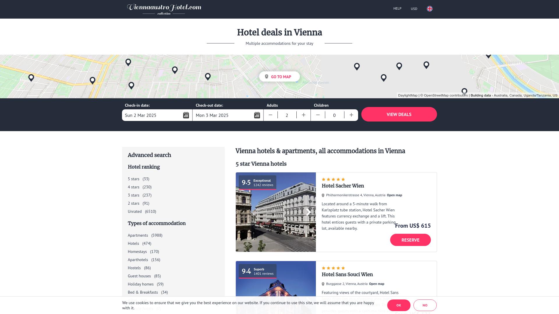 Die Webseite viennaustrohotel.com bietet eine Plattform zur Buchung von Unterkünften in Wien. Nutzer können verschiedene Suchfilter nutzen, um passende Hotels und Apartments in der Stadt zu finden. Die Seite verfügt über eine Kartenansicht, die Usern ermöglicht, Hotels in ihrer gewünschten Region anzuzeigen. Auf dem Hauptscreen können Nutzer ihre Reisedaten eingeben, einschließlich Check-in- und Check-out-Daten sowie die Anzahl der Erwachsenen und Kinder. Die Webseite zeigt eine Liste von Unterkünften, die nach Hotelrang eingeteilt sind. Hierbei sind die Unterkünfte in Kategorien wie 5-Sterne-Hotels, 4-Sterne-Hotels, 3-Sterne-Hotels und weitere gegliedert. Es werden auch andere Arten von Unterkünften angeboten, darunter Apartments, Homestays, Aparthotels, Hostels, Gästehäuser, Ferienhäuser und Bed & Breakfasts. Die Anzeige von Unterkünften umfasst Details wie Sterne-Bewertungen und Kundenrezensionen, die den Nutzern helfen sollen, eine informierte Entscheidung zu treffen. Einige der aufgeführten Hotels beinhalten beispielsweise das Hotel Sacher Wien und das Hotel Sans Souci Wien. Zu jedem Hotel werden bestimmte Informationen bereitgestellt, wie die Adresse, eine kurze Beschreibung der Lage und der angebotenen Dienstleistungen. Preise werden ebenfalls angezeigt, die je nach Hotel und Zeitrahmen variieren können. Die Webseite bietet auch eine erweiterte Suchfunktion, die es Nutzern ermöglicht, ihre Ergebnisse weiter zu verfeinern, indem sie spezifische Kriterien auswählen, wie die Art der Unterkunft oder den Hotelranking. Zudem finden sich auf der Seite Informationen zu besonderen Angeboten und Rabatten für Unterkünfte. Zusammenfassend lässt sich sagen, dass die Webseite eine umfassende Übersicht über die verfügbaren Unterkunftsmöglichkeiten in Wien bereitstellt, wobei der Nutzer die Freiheit hat, seine Suche an persönliche Vorlieben und Bedürfnisse anzupassen.