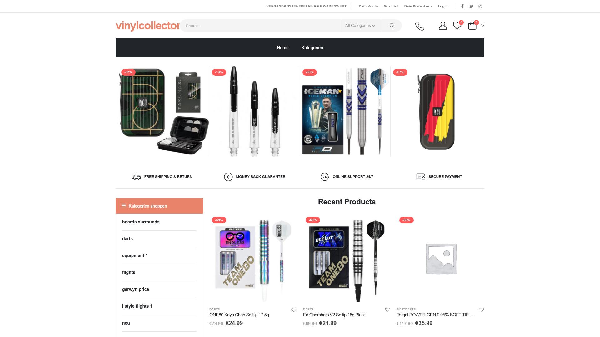Die Webseite „vinylcollector“ bietet eine Auswahl an Produkten, die überwiegend im Bereich des Dart-Sports angesiedelt sind. Sie ist in verschiedene Kategorien unterteilt, darunter „Darts“, „Boards Surrounds“, „Equipment“ und „Flights“. Dies deutet darauf hin, dass die Seite sich speziell an Dart-Spieler und -Enthusiasten richtet. In der Kategorie „Darts“ werden verschiedene Modelle von Darts angeboten, einschließlich Sets für Softips und Steeldarts. Zu den angezeigten Produkten zählen zum Beispiel eine Kombination aus Darts und Aufbewahrungslösungen und spezielle Dartmodelle mit unterschiedlichen Gewichtsangaben. Die Preise sind häufig durchgestrichen und es werden erhebliche Rabatte angeboten, was auf eine Rabattaktion oder Sonderangebote hinweisen könnte. Zusätzlich zur Auswahl an Darts werden auch Zubehörteile wie Dartflights, Schäfte und andere verwandte Produkte präsentiert. Es gibt zudem Optionen für persönliche Anfragen und ein Abschnitt für neue Produkte, was auf eine mögliche Aktualisierung des Angebots hinweist. Die Webseite hebt einige Kundenservices hervor, darunter „kostenloser Versand und Rücksendungen“ sowie eine „Geld-zurück-Garantie“. Ein 24/7 Online-Support wird ebenfalls angeboten, der es Kunden ermöglicht, Fragen oder Anliegen zu klären, was auf eine benutzerfreundliche Unterstützung hinweist. Die Benutzeroberfläche scheint übersichtlich gestaltet zu sein, mit klaren Kategorien für eine einfache Navigation und Produktauswahl. Die allgemeine Gestaltung und Struktur der Webseite zielen darauf ab, den Nutzern eine einfache Einkaufserfahrung zu ermöglichen. Insgesamt bietet die Webseite eine Plattform für den Kauf von Dart-Produkten und -Zubehör, ohne eine umfassende Beratung oder eine Vielzahl von verschiedenen Sportarten abzudecken. Der Fokus liegt klar auf dem Dart-Sport, was sich in der Produktauswahl und den angebotenen Dienstleistungen widerspiegelt.
