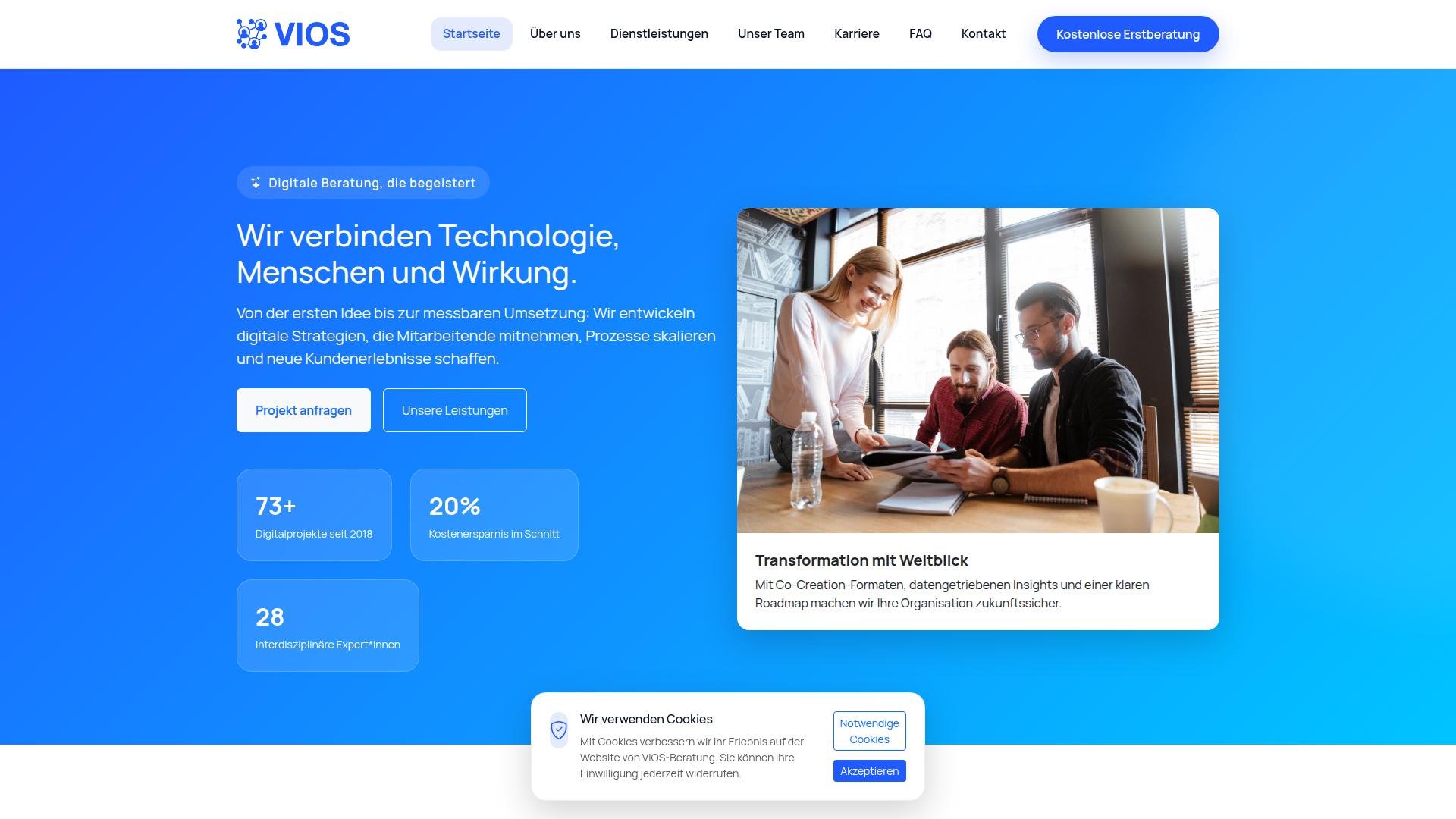 Die Webseite Vios bietet eine digitale Beratungsplattform an, die darauf abzielt, Technologien, Menschen und deren Wirkungen zu verbinden. Sie präsentiert sich als eine Dienstleistung, die von der Ideenfindung bis zur praktischen Umsetzung digitale Strategien entwickelt, um Mitarbeitende einzubeziehen, Prozesse zu optimieren und neue Kundenerlebnisse zu schaffen. Auf der Startseite wird der Fokus auf digitale Beratung gelegt, wobei eine kostenlose Erstberatung angeboten wird. Die Webseite hebt hervor, dass seit 2018 über 73 digitale Projekte durchgeführt wurden und im Durchschnitt ein Kostensparpotential von 20 % erreicht werden kann. Zudem werden 28 interdisziplinäre Experten genannt, die Teil des Teams sind. Vios betont, dass ihre Dienstleistungen auf den Bereichen Transformation und Co-Creation basieren. Es wird angegeben, dass datengestützte Insights für die Entwicklung einer klaren Roadmap für Organisationen genutzt werden, um deren zukünftige Sicherheit zu gewährleisten. Dies impliziert eine strategische Herangehensweise an digitale Transformationsprojekte. Auf der Webseite sind außerdem verschiedene Optionen zur direkten Kontaktaufnahme zu finden, wie ein Button zur Anfrage eines Projekts sowie zu weiteren Informationen über die angebotenen Leistungen. Der Nutzer kann auf einfache Weise weitere Details zu den Dienstleistungen anfordern. Zusätzlich wird auf die Verwendung von Cookies hingewiesen, um die Nutzererfahrung auf der Seite zu verbessern. Es besteht die Möglichkeit, die Cookie-Einstellungen nach Bedarf anzupassen. Insgesamt stellt die Webseite Vios eine digitale Beratungsorganisation dar, die sich auf die Verbindung von Technologie und menschlichem Engagement fokussiert. Die Nutzer werden eingeladen, sich über die angebotenen Dienstleistungen zu informieren und bei Bedarf Kontakt aufzunehmen.