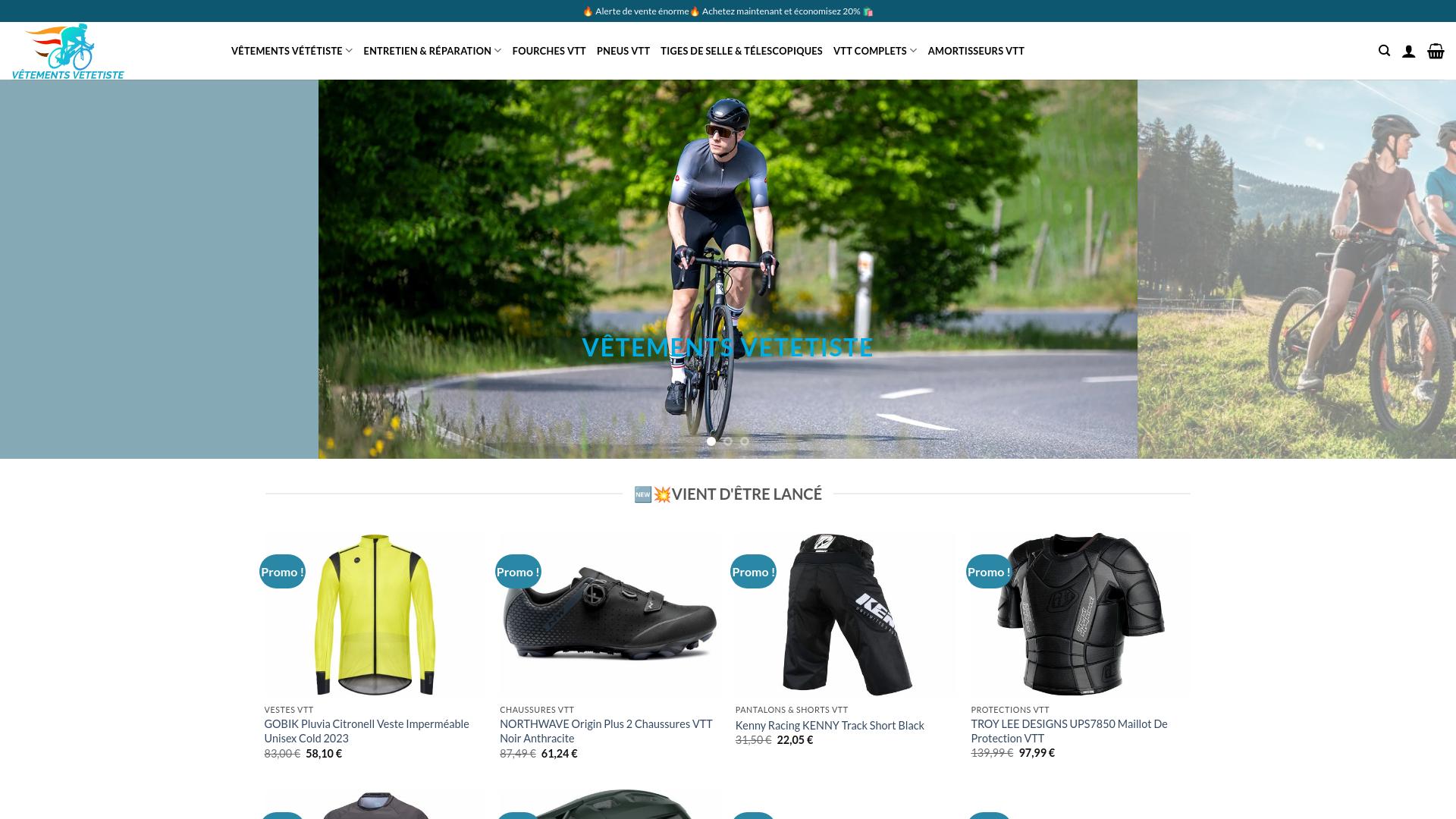 Die Webseite „Vêtements Vététiste“ bietet eine Auswahl an Produkten, die sich auf Bekleidung und Ausrüstung für den Radsport, insbesondere für Mountainbiking, konzentrieren. Die Hauptkategorien umfassen verschiedene Arten von Kleidungsstücken, Schuhen, Shorts und Schutzartikeln. Unter der Rubrik „Vêtements Vététiste“ finden die Nutzer eine Vielzahl von Bekleidungsoptionen, die für unterschiedliche Wetterbedingungen und sportliche Anforderungen ausgelegt sind. Besonders hervorgehoben werden Jacken und Westen, von denen einige als wasserdicht beschrieben sind. Ein Beispiel für ein angepriesenes Produkt ist die „GOBIK Pluvia Citronell Weste“, die zu einem reduzierten Preis angeboten wird. In der Kategorie „Chaussures VTT“ sind Mountainbike-Schuhe gelistet, die für ihre Anpassungsfähigkeit und Leistung beworben werden. Ein Beispiel ist der „NORTHWAVE Origin Plus 2“, der in verschiedenen Größen verfügbar ist und ebenfalls zu einem ermäßigten Preis angeboten wird. Des Weiteren bietet die Seite verschiedene Shorts und Hosen für Mountainbiker an. Hierzu gehört der „Kenny Racing KENNY Track Short“, der ebenfalls mit einem Preisnachlass präsentiert wird. Die Kategorie „Protections VTT“ enthält Produkte, die zum Schutz der Fahrer während des Radfahrens gedacht sind. Ein Beispiel ist das „TROY LEE DESIGNS UPS7850 Maillot“, welches als Schutzausrüstung für Mountainbiker gelistet ist und zu einem reduzierten Preis verfügbar ist. Die Webseite zeigt zudem Hinweise auf laufende Verkaufsaktionen und Promotions für die genannten Produkte. Die Benutzeroberfläche scheint so gestaltet zu sein, dass die Benutzer leicht zwischen den verschiedenen Kategorien navigieren und schnell auf die gewünschten Produkte zugreifen können. Zusammenfassend lässt sich sagen, dass die Webseite eine konzentrierte Produktpalette für Radsport- und Mountainbike-Ausrüstung anbietet, mit Fokus auf Bekleidung, Schuhe und schützende Ausrüstung.