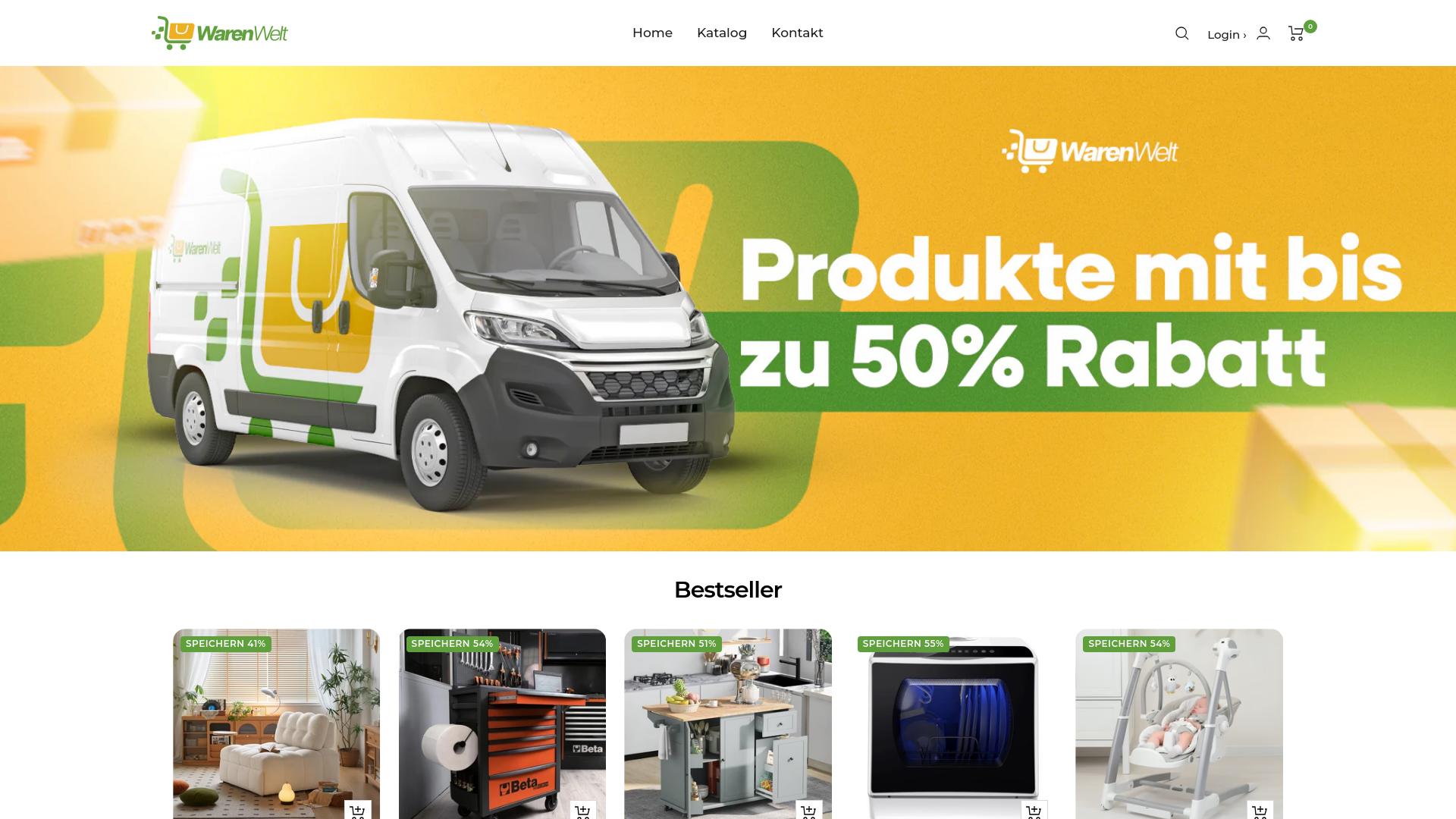 Die Webseite „WarenWelt“ präsentiert sich als Online-Shop, der eine Vielzahl von Produkten aus unterschiedlichen Kategorien anbietet. Auf der Startseite ist ein Lieferfahrzeug abgebildet, das darauf hinweist, dass die angebotenen Waren versendet werden. Das Layout der Seite nutzt eine helle Farbpalette, die aus Grün- und Gelbtönen besteht. In der Sektion „Bestseller“ werden verschiedene Artikel angezeigt, die mit Prozentsätzen versehen sind, die auf mögliche Rabatte hinweisen. Zu den kategorisierten Produkten gehören Möbel, Küchengeräte, Babyprodukte und andere Haushaltswaren. Einige der aufgeführten Artikel sind beispielsweise ein gemütlicher Sessel, eine mobile Werkbank sowie Küchenmobiliar. Jedes Produkt verfügt über eine Abbildung und eine Angabe zum Preisnachlass, wobei die Rabatte bis zu 55 % betragen können. Zusätzlich zu den Produkten gibt es einen Link zum „Katalog“, der wahrscheinlich eine umfassendere Auswahl an Artikeln bietet. Die Seite enthält auch einen Abschnitt „Kontakt“, wo Nutzer möglicherweise weitere Informationen oder Unterstützung anfordern können. Das Benutzerinterface scheint einfach und benutzerfreundlich gestaltet zu sein, mit Optionen zum Einloggen und zur Verwaltung des Warenkorbs. Die Webseite zielt darauf ab, Käufern eine breite Palette von Waren zu reduzierten Preisen anzubieten. Es wird nicht explizit auf die Herstellermarken oder spezifische Qualitätsstandards eingegangen, sondern lediglich die Art der angebotenen Produkte hervorgehoben. Insgesamt legt die Webseite den Fokus auf Verkaufsaktionen und Rabatte, um das Kaufinteresse der Besucher zu wecken. Es gibt keine weiteren Informationen zu Rückgabebedingungen, Versandoptionen oder Kundenbewertungen, die die Kaufentscheidung beeinflussen könnten. Die klare Struktur der Seite ermöglicht es Nutzern, schnell durch die angebotenen Produkte zu navigieren und potenziell Kaufentscheidungen zu treffen.