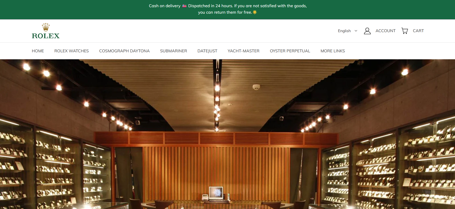 Die Webseite bietet eine Auswahl an Rolex-Uhren an und präsentiert sich in einem ansprechenden Design. Im oberen Bereich der Seite befinden sich Menüpunkte, die zu verschiedenen Modellreihen von Rolex führen, darunter der Cosmograph Daytona, Submariner, Datejust und Yacht-Master. Diese Kategorien ermöglichen es Nutzern, spezifisch nach den gewünschten Modellen zu suchen und detaillierte Informationen zu den einzelnen Uhren zu erhalten. Die Startseite zeigt eine visuell ansprechende Bilddarstellung eines Innenraums, der anscheinend ein Verkaufsraum für Uhren ist, was auf eine luxuriöse Verkaufsumgebung hindeutet. Die Beleuchtung und die Anordnung der Uhren in Vitrinen können darauf hinweisen, dass Wert auf eine hochwertige Präsentation der Produkte gelegt wird. Die Gestaltung der Seite und die Präsentation der Uhren könnten darauf abzielen, ein hochwertiges Einkaufserlebnis zu vermitteln. Einige der dargestellten Inhalte heben Merkmale der Rolex-Uhren hervor, darunter möglicherweise technische Daten und besondere Eigenschaften, die für Sammler und Uhrenliebhaber von Interesse sind. Zudem scheint die Webseite einen sofortigen Kauf und eine schnelle Lieferung innerhalb von 24 Stunden anzubieten, was in der Kategorie E-Commerce üblich ist. Die Seite enthält eine Anmerkung zu den Zahlungs- und Rückgabemöglichkeiten, die darauf hinweist, dass die Bezahlung bei Lieferung erfolgt und dass Rücksendungen ohne zusätzliche Kosten möglich sind, wenn der Kunde mit dem Produkt nicht zufrieden ist. Diese Bedingungen sind in vielen Online-Shops verbreitet und sollen den Kunden eine einfache Handhabung beim Kauf bieten. Die Webseite ist in mehreren Sprachen verfügbar, was darauf hindeutet, dass sie ein internationales Publikum ansprechen möchte. Neben den spezifischen Uhrenmodellen finden sich möglicherweise auch Linkoptionen zu anderen Seiten innerhalb des Angebots, um eine nahtlose Navigation zu gewährleisten. Zusammenfassend lässt sich sagen, dass die Webseite eine Plattform für den Online-Kauf von Rolex-Uhren bietet, die auf eine einfache Nutzung und ansprechende Produktpräsentation ausgerichtet ist.