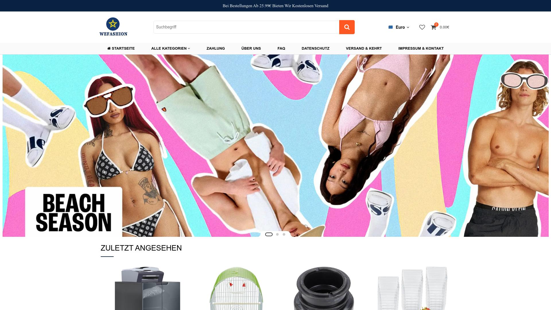 Die Webseite WEFASHION präsentiert eine Vielzahl von Produkten, die hauptsächlich Bekleidung und Accessoires umfassen. Der Schwerpunkt liegt auf Freizeit- und Strandmode, wie Badebekleidung, Shorts und Sportbekleidung, die in unterschiedlichen Farb- und Stilvariationen angeboten werden. Die visuelle Gestaltung der Seite ist auffällig und modern, mit lebhaften Farben und ansprechenden Grafiken, die im Hintergrund eingeblendet sind. Der obere Bereich der Seite enthält einen Suchfeld und Menüpunkte, die den Nutzern den Zugriff auf verschiedene Kategorien erleichtern. Zu den verfügbaren Kategorien gehören die ‚Startseite‘, ‚Zahlung‘, ‚Über uns‘, ‚FAQ‘, ‚Datenschutz‘, ‚Versand & Kerri‘ sowie ‚Impressum & Kontakt‘. Dies ermöglicht eine schnelle Orientierung und den Zugang zu notwendigen Informationen über die Seite. Unter des Hauptbereichs gibt es eine Rubrik mit dem Titel „ZULETZT ANGESEHEN“, die Produkte anzeigt, die der Nutzer kürzlich betrachtet hat. Dies kann eine Funktion sein, die hilft, die Produktauswahl zu personalisieren und den Nutzern ermöglicht, ihre vorherigen Interessen schnell wiederzufinden. Zusätzlich informiert die Webseite über Versandbedingungen, wobei ein kostenloser Versand ab einem Bestellwert von 25,99 Euro angeboten wird. Dies könnte potenzielle Käufer ansprechen, die nach einer kosteneffizienten Option suchen. Die Zahlungsmöglichkeiten werden ebenfalls auf der Seite aufgeführt, was auf eine versuchen könnte, den Nutzern eine bequeme und sichere Kaufabwicklung anzubieten. Die Webseite bietet zudem Informationen zu Datenschutzmaßnahmen und den allgemeinen Geschäftsbedingungen, die wichtig für den rechtlichen Rahmen und den Schutz der Nutzerdaten sind. Insgesamt vermittelt die Seite den Eindruck einer umfassenden Plattform für Mode und Lifestyle-Produkte mit einem klaren Fokus auf aktuelle Trends und saisonale Angebote. Die visuelle Gestaltung und der einfache Zugang zu Informationen könnten darauf abzielen, ein jüngeres Publikum anzusprechen, das nach besonderen Modestücken sucht.