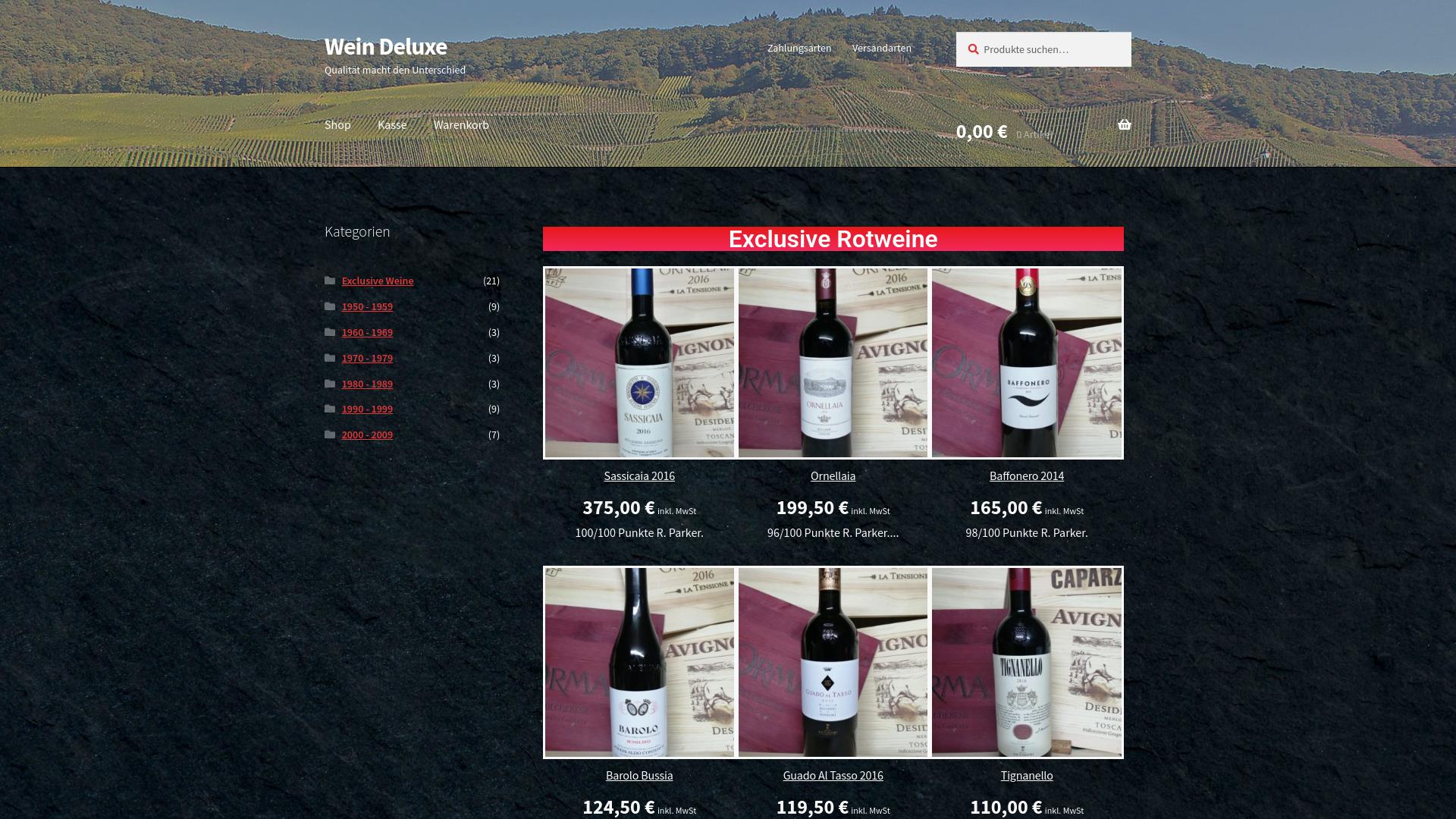 Die Webseite „Wein Deluxe“ bietet eine Auswahl an Weinen, die in verschiedenen Kategorien präsentiert werden. Im Vordergrund stehen exklusive Rotweine, die aus verschiedenen Jahrgängen stammen. Die Seite listet Weine mit spezifischen Preisangaben, die inklusive Mehrwertsteuer sind. Beispielsweise wird eine Flasche „Sassicaia 2016“ zu einem Preis von 375,00 Euro angeboten, während „Ornellaia 2016“ für 199,50 Euro erhältlich ist. Weitere Weine aus der Kategorie der exklusiven Rotweine beinhalten „Baffonero 2014“ zu einem Preis von 165,00 Euro und „Barolo Bussia“ für 124,50 Euro. Zusätzlich sind die Weine nach Jahrgängen kategorisiert, von den 1950er bis den 2000er Jahren, und umfassen unter anderem die Jahre 1960-1969, 1970-1979, 1980-1989 und 1990-1999. In jeder Kategorie sind mehrere Weine angeführt, die die Produktpalette erweitern. Die Webseite verwendet ein ansprechendes visuelles Layout mit Bildern der Weinflaschen und einer Beschreibung der Weine, wobei einige Produkte auch eine Bewertung auf Basis der Punktevergabe von R. Parker beinhalten. Diese Bewertungen sind in der Darstellung der Weine ersichtlich, wobei beispielsweise „Sassicaia 2016“ eine Bewertung von 100 Punkten und „Ornellaia 2016“ 96 Punkte erhält. Die Benutzeroberfläche ermöglicht es Besuchern, Produkte zu suchen und dem Warenkorb beizufügen. Es gibt einen klaren Zugang zu Informationen über Zahlungsarten und Versandoptionen. Die Gestaltung der Webseite zielt darauf ab, den Nutzern eine übersichtliche Navigation durch die verschiedenen Angebote zu ermöglichen. Die Informationen zu den Preisen und Bewertungen sind direkt neben den entsprechenden Produkten angeordnet, was den Nutzern einen schnellen Überblick über die verfügbaren Weine verschafft. Der Gesamtfokus der Webseite liegt auf einer gezielten Präsentation von exklusiven Weinen, die sowohl für Sammler als auch für Weinliebhaber von Interesse sein könnten.