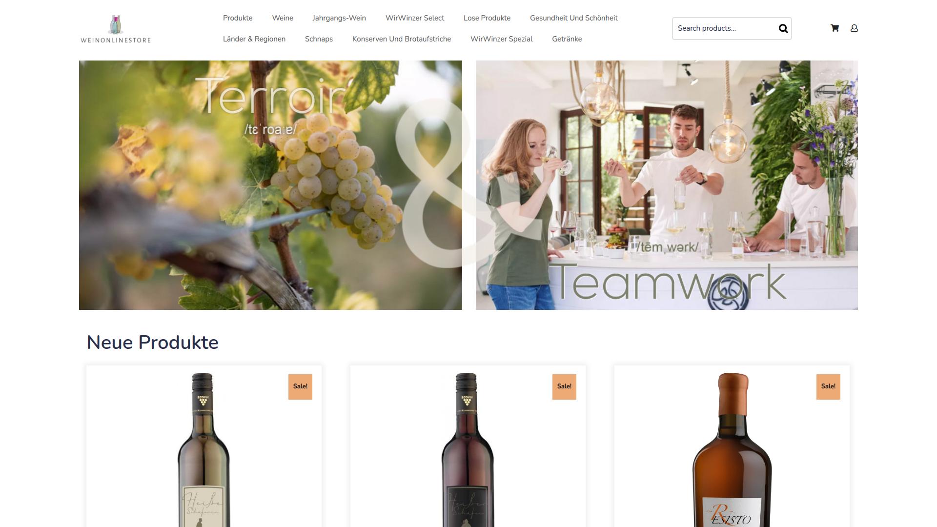 Die Webseite „Weinonlinestore“ bietet eine Vielzahl von Produkten im Bereich Wein und Getränke an. Die Hauptkategorien umfassen Weine, Schnäpse, sowie weitere Produktlinien wie Konserven und Brotaufstriche. Die Seite präsentiert sowohl einzelne Flaschen als auch Produkte in größeren Mengen. Im oberen Bereich der Webseite wird durch ansprechende visuelle Elemente auf das thematische Konzept der Seite eingegangen, das sich auf Weinkultur und Zusammensarbeit fokussiert. Die Hauptnavigation umfasst verschiedene Sektionen, darunter „Produkte“, „Jahrgangs-Wein“, „WirWinzer Select“, sowie spezifische Bereiche für Länderauswahl und regionale Weine. Nutzer können Produkte nach Kategorien filtern, um gezielt nach verschiedenen Weinsorten oder Schnaps zu suchen. Eine besondere Hervorhebung findet sich zudem bei neuen Produkten, die als „Neu“ und teilweise auch mit einem Rabatt versehen angeboten werden. Zusätzlich wird eine Kategorie für „Gesundheit und Schönheit“ erwähnt, die möglicherweise Produkte in diesem Bereich umfasst, jedoch sind hierzu keine spezifischen Details enthalten. Der untere Bereich der Webseite zeigt mehrere Weingläser und Flaschen in attraktiven Darstellungen, was auf die Möglichkeit hinweist, sich visuell über das Angebot zu informieren. Die Seite ist benutzerfreundlich gestaltet und bietet eine Suchfunktion sowie einen Bereich für den Warenkorb, in dem Nutzer ihre ausgewählten Produkte verwalten können. Die Benutzeroberfläche legt Wert auf eine klare Übersicht, sodass Besucher schnell die gewünschten Produkte finden und Informationen dazu abrufen können. Insgesamt bietet die Webseite ein breit gefächertes Sortiment an Wein- und Getränkespezialitäten sowie zusätzlichen Lebensmitteln. Die Präsentation der Produkte in verschiedenen Kategorien könnte auch etwas über deren Herkunft und Zubereitung verraten, ist jedoch im Screenshot nicht explizit ersichtlich.