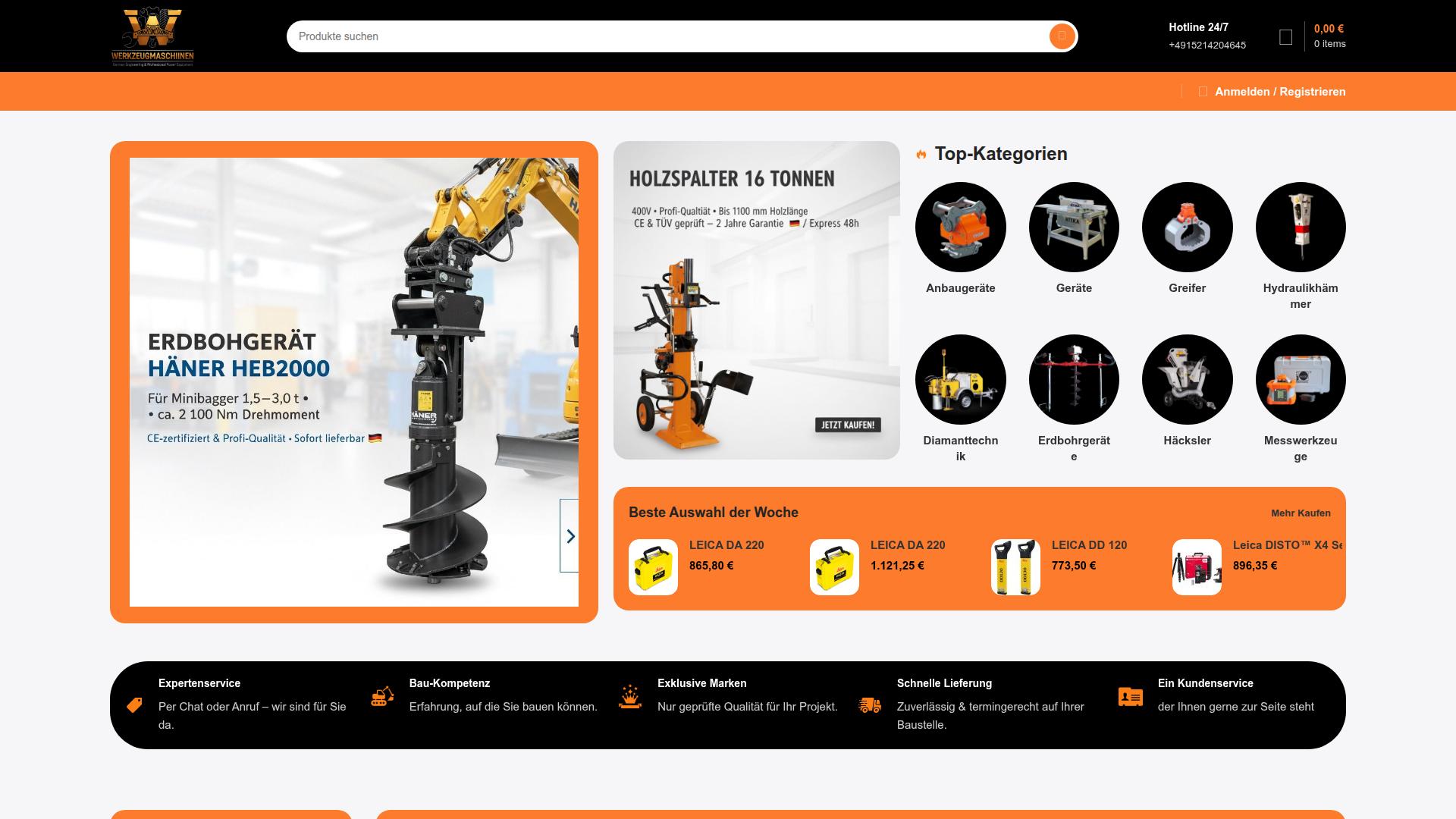 Die Webseite bietet eine Vielzahl von Maschinen und Zubehör für den Bau- und Gartenbereich an. Im Vordergrund stehen Produkte wie Erdbohrgeräte, Holzspalter und verschiedene Anbaugeräte. Eine spezifische Produktbeschreibung erwähnt das Erdbohrgerät „Hänner HEB2000“, das für Minibagger mit einem Gewicht von 1,5 bis 3,0 Tonnen geeignet ist und ein Drehmoment von etwa 2.100 Nm aufweist. Zudem wird auf die CE-Zertifizierung und die professionelle Qualität dieses Geräts hingewiesen. Ein weiteres hervorgehobenes Produkt ist ein Holzspalter mit einer Leistung von 16 Tonnen, der für Holzstücke bis zu einer Länge von 1.100 mm geeignet ist. Die Webseite weist darauf hin, dass der Holzspalter ebenfalls CE- und TÜV-geprüft ist und eine zwei-jährige Garantie bietet. Unter den angebotenen Kategorien sind Anbaugeräte, Geräte, Greifer, Häcksler sowie spezielle Geräte für die Diamanttechnik und Messtechnik aufgeführt. Diese Kategorien deuten auf eine umfassende Palette von Werkzeugen hin, die sowohl für professionelle Anwender als auch für Hobbyhandwerker von Interesse sein könnten. Zusätzlich bietet die Webseite einen Service, der als „Expertenservice“ bezeichnet wird, sowie die Möglichkeit, direkt über einen Chat oder Telefon Kontakt aufzunehmen. Darüber hinaus wird „Bau-Kompetenz“ beworben, die auf Erfahrung im Bauwesen hinweist, um Kunden bei ihren Projekten zu unterstützen. Die Seite enthält auch Hinweise auf eine schnelle Lieferung sowie die Verfügbarkeit exklusiver Marken. Es werden aktionsbezogene Angebote wie die „Beste Auswahl der Woche“ hervorgehoben, die Rabattpreise für bestimmte Produkte anzeigt. Insgesamt richtet sich die Webseite an Verbraucher, die Maschinen und Werkzeuge für Bau- und Gartenarbeiten suchen, und bietet eine Übersicht über aktuelle Produkte und Dienstleistungen in diesem Bereich.
