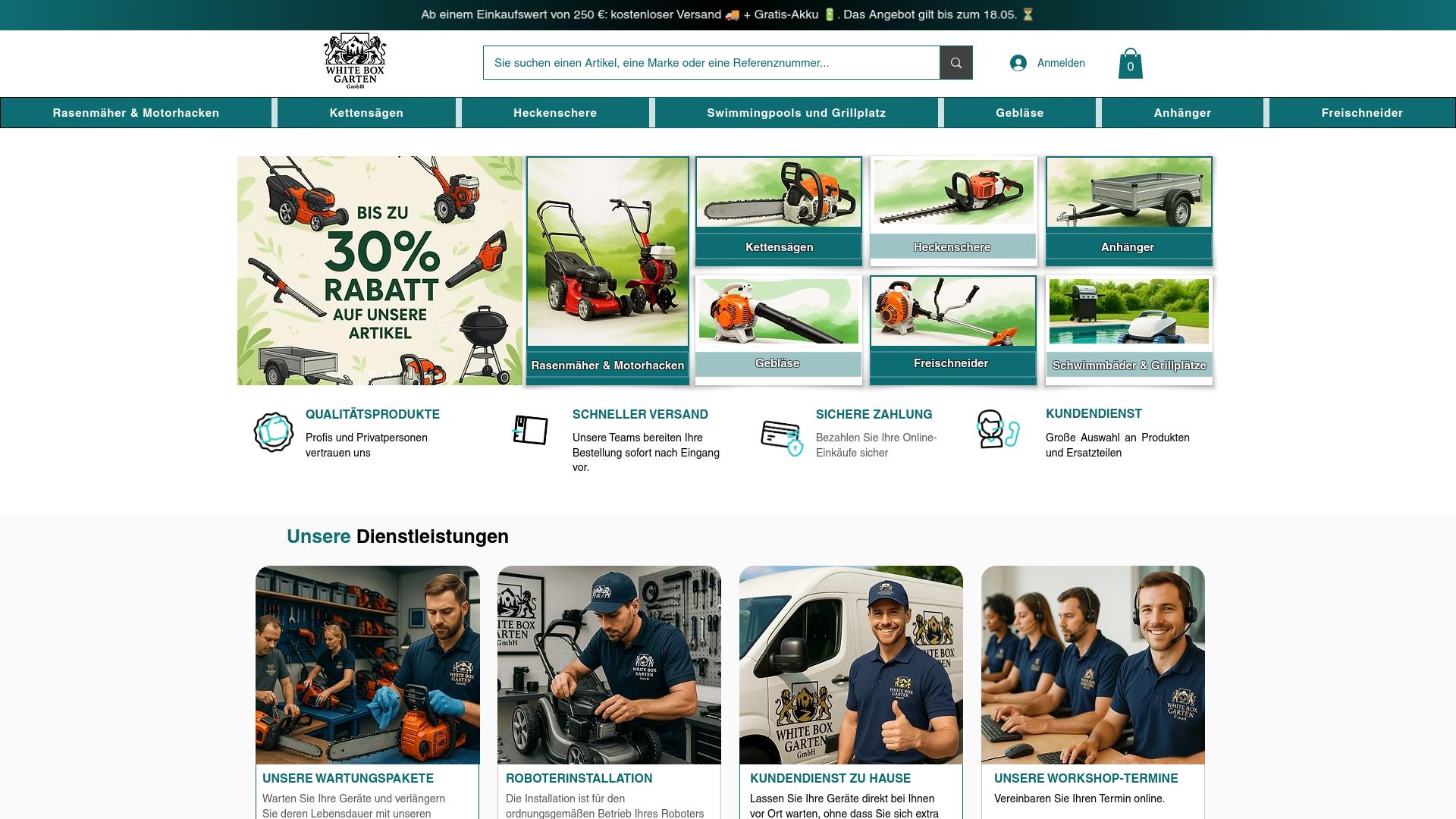 Die Webseite „White Box Garten GmbH“ bietet eine Vielzahl von Produkten und Dienstleistungen im Bereich Garten- und Landschaftspflege an. Die Produktpalette umfasst Rasenmäher, Motorhacken, Kettensägen, Heckenscheren, Bläser, Freischneider sowie Anhänger. Diese Werkzeuge sind sowohl für den professionellen Einsatz als auch für den privaten Gebrauch ausgelegt. Auf der Startseite wird auf aktuelle Rabatte von bis zu 30 % auf bestimmte Artikel hingewiesen, was darauf hindeutet, dass eine regelmäßig wechselnde Promotion für Kunden zur Verfügung steht. Darüber hinaus wird eine Auswahl an qualitativ hochwertigen Produkten betont, die sowohl von Fachleuten als auch von Privatpersonen genutzt werden können. Neben dem Verkaufsangebot listet die Webseite verschiedene Dienstleistungen. Hierzu zählen Wartungspakete für Gartenwerkzeuge, die es Nutzern ermöglichen, ihre Geräte bei der Firma warten zu lassen. Darüber hinaus wird ein Service zur Installation von Robotern angeboten, dessen Ziel es ist, die Funktionsfähigkeit von Rasenrobotern zu gewährleisten. Ein weiterer Service ist der „Kundendienst zu Hause“, bei dem die Mitarbeiter die Geräte direkt beim Kunden vor Ort warten oder reparieren. Dies könnte für Nutzer von Interesse sein, die eine bequemere Lösung für die Wartung ihrer Geräte bevorzugen. Zusätzlich bietet die Webseite die Möglichkeit, Werkstatttermine online zu buchen, um Dienstleistungen in Anspruch zu nehmen oder Beratungen zu erhalten. Die Webseite beschränkt sich nicht nur auf den Verkauf von Produkten, sondern stellt auch umfangreiche Unterstützung in Form von Beratungen und Wartungsdiensten bereit. Die Zahlungsmethoden werden als sicher dargestellt, wobei auf die Möglichkeit hingewiesen wird, Online-Einkäufe sicher abzuwickeln. Der Versand der bestellten Produkte wird schnell und effizient beschrieben. Insgesamt bietet die Webseite ein umfassendes Sortiment, das sowohl hochwertige Produkte als auch relevante Dienstleistungen für Gartenliebhaber und professionelle Nutzer umfasst.