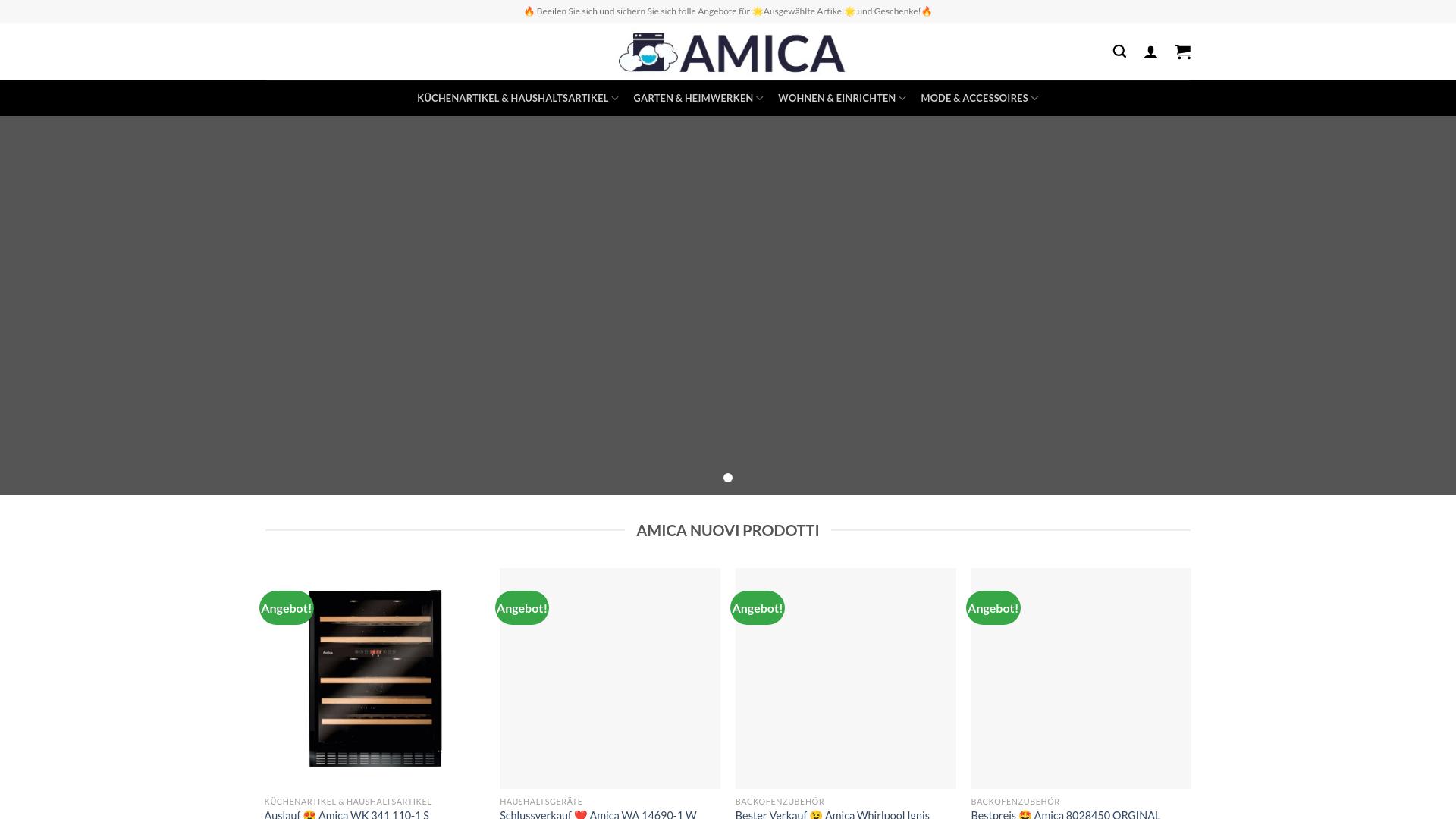 Die Webseite präsentiert eine Auswahl von Produkten im Bereich Küchenartikel und Haushaltsgeräte. Sie ist unter dem Namen „AMICA“ bekannt und kategorisiert ihre Angebote in verschiedene Sektionen, darunter Küchenartikel, Haushaltsgeräte, Garten und Heimwerken, sowie Wohnen und Einrichten. Die Produktpräsentation umfasst verschiedene Arten von Geräten und Zubehör, die sowohl für den häuslichen Gebrauch als auch für Gartenarbeit nützlich sein können. Im Bereich Küchenartikel werden Geräte wie Weinkühlschränke displayed, wobei auch spezifische Modelle aufgeführt sind, wie der „Amica Wk 341.110 L.S“. Zusätzlich gibt es Angebote für Haushaltsgeräte, darunter verschiedene Kühlschränke und hochwertige Küchentechnik. Zu den Produkten im Segment Backofen-Zubehör zählen Artikel wie spezielle Aufsatzgeräte oder Ersatzteile, die zur Optimierung der Nutzung von Backöfen dienen. Die Webseite hat einen klar strukturierten Layout, das es den Nutzern ermöglicht, die unterschiedlichen Kategorien einfach zu navigieren. Es werden auch spezielle Angebote hervorgehoben, was darauf hindeutet, dass Nutzer auf der Suche nach Rabatten oder bestimmten Aktionen hier fündig werden können. Die Darstellung der Produkte ist visuell ansprechend und bietet ansprechende Informationen über die Artikel, die zum Kauf angeboten werden. Darüber hinaus werden auf der Webseite auch Sektionen für Mode und Accessoires angezeigt, was die Produktvielfalt weiter erhöht und dazu einlädt, verschiedene Artikel aus unterschiedlichen Kategorien zu erkunden. Die Nutzer können Produkte in einen Warenkorb legen und haben die Möglichkeit, ein Konto zu erstellen oder sich anzumelden, um ihre Einkaufserfahrung zu personalisieren. Insgesamt gibt die Webseite einen Überblick über Freizeit- und Haushaltsprodukte, die für den häuslichen Gebrauch nützlich sein können. Die Bereitstellung unterschiedlicher Produktkategorien könnte für Verbraucher, die sich für Haushaltswaren und Küchenausstattung interessieren, von Interesse sein.